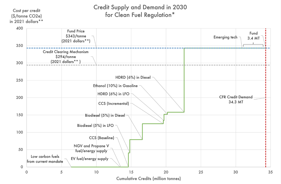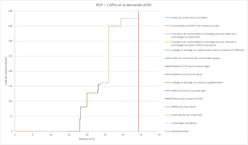 À partir de 2036, en raison d’une réduction prévue de la demande en combustibles liquides et l’augmentation du nombre de véhicules électriques, les UC de technologies émergentes ne seront plus nécessaires pour satisfaire à la demande. La contribution maximale de 10% du Fonds aux fins de conformité ne sera plus nécessaire, bien que son utilisation ne disparaîtra complètement avant 2040. D’ici là, le coût marginal de création des crédits devrait tomber à 161 $, avec un coût moyen de 30 $.