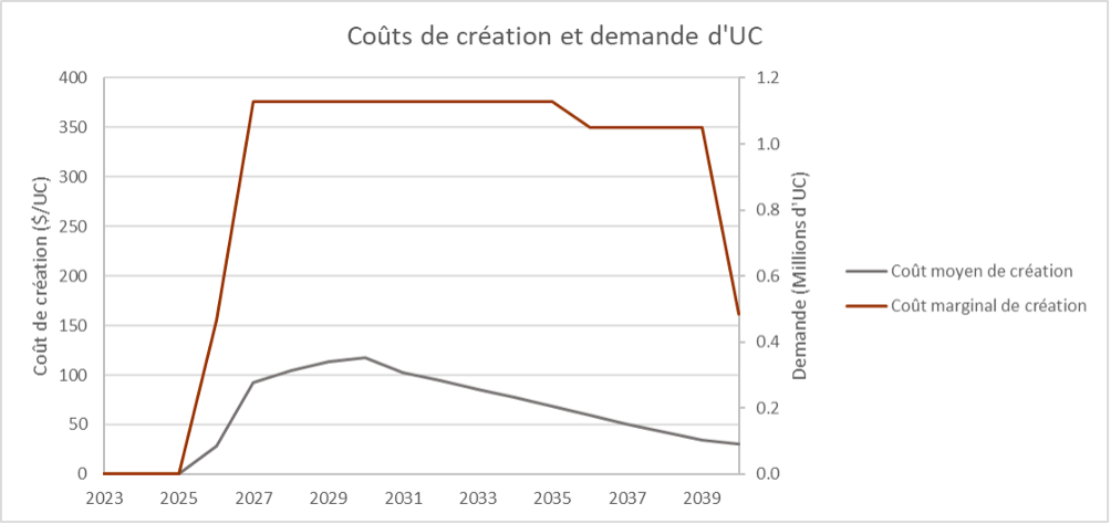 L’année 2026 est la première où la création d’UC « incrémentaux » (c’est-à-dire qui ne seraient pas créés dans l’absence du RCP) sera nécessaire. C’est l’année où les UC accumulées sont censées s’épuiser et six nouvelles filières seront nécessaires pour répondre à la demande. Pour mettre ces filières en ligne, il faudra planifier et dépenser en capital. L’incitation à la création d’UC incrémentales fonctionne de façon à ce que l’alternative à la création soit d’acheter des UC auprès du Fonds aux fins de conformité à un coût de 350 $, bien au−dessus des coûts moyens (28$) et marginaux (155$) de création pour cette année.